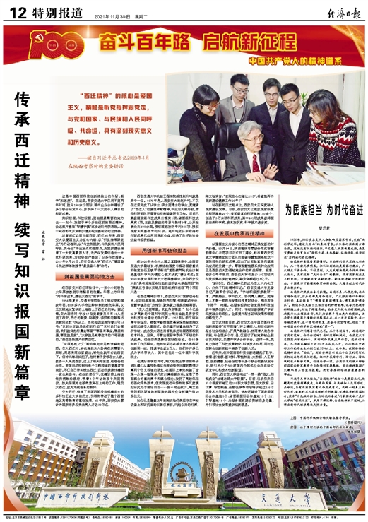 “新时代,西迁精神已然成为交大人内化于心、外化于行的精神印记。”西安交通大学党委书记卢建军告诉记者,“学校积极探索教研一体、产教融合、学科交叉、协同育人模式,把培养人才第一资源与发展科技更好结合,携手攻关‘卡脖子’难题,在服务经济社会发展和科技创新中培养创新人才。同时,学校创新探索产学研深度融合的路径,全面提升服务区域发展和国家战略能力。”