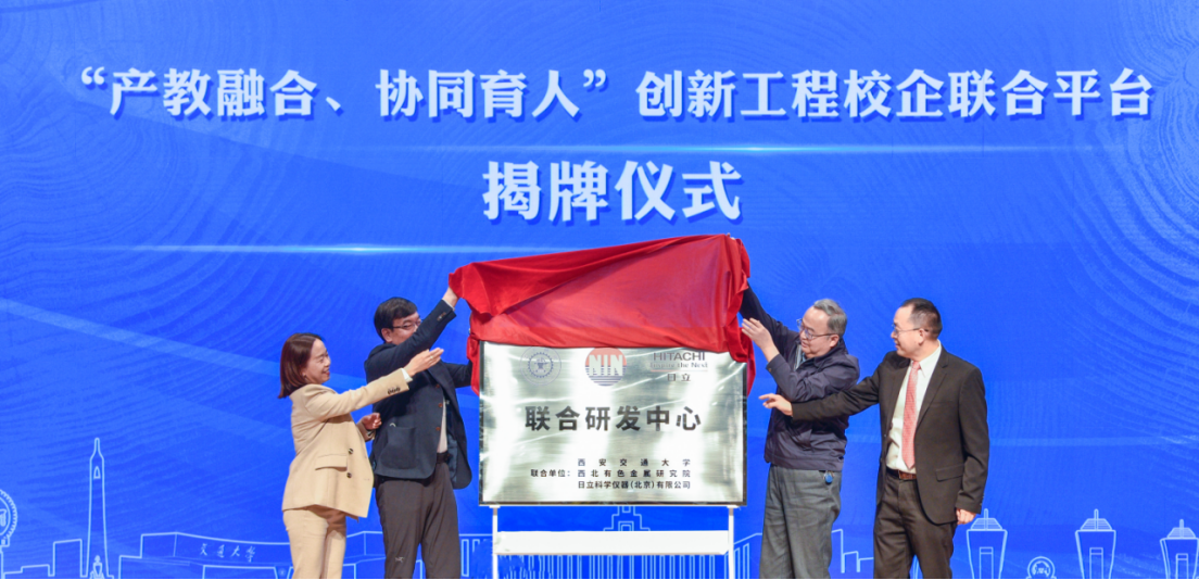 中国工程院院士张平祥、中国科学院院士孙军、西安交大材料学院院长单智伟、日立科学仪器有限公司西安分部总经理蒲蓉共同为“西安交通大学—日立公司—西北有色金属研究院联合研发中心”揭牌。