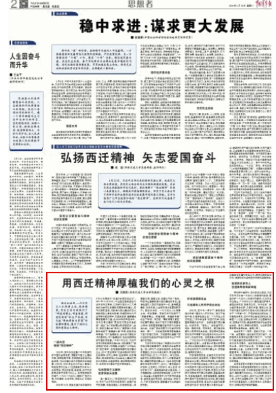 在当前两个一百年、西部大开发、一带一路、全面建成小康社会的历史机遇下,在新冠肺炎疫情防控的重大危机下,作为新时代奋进者的西迁精神新传人,交大人要牢记总书记嘱托,自觉用西迁精神厚植心灵之根、滋养行动之源、引领奋斗之举、铸牢事业之基,弘扬胸怀大局、心有大我的爱国精神,艰苦创业、玉汝于成的奋斗精神,扎根实际、勇攀高峰的创新精神,公而忘私、埋头深耕的奉献精神,创造中国高等教育的新辉煌。